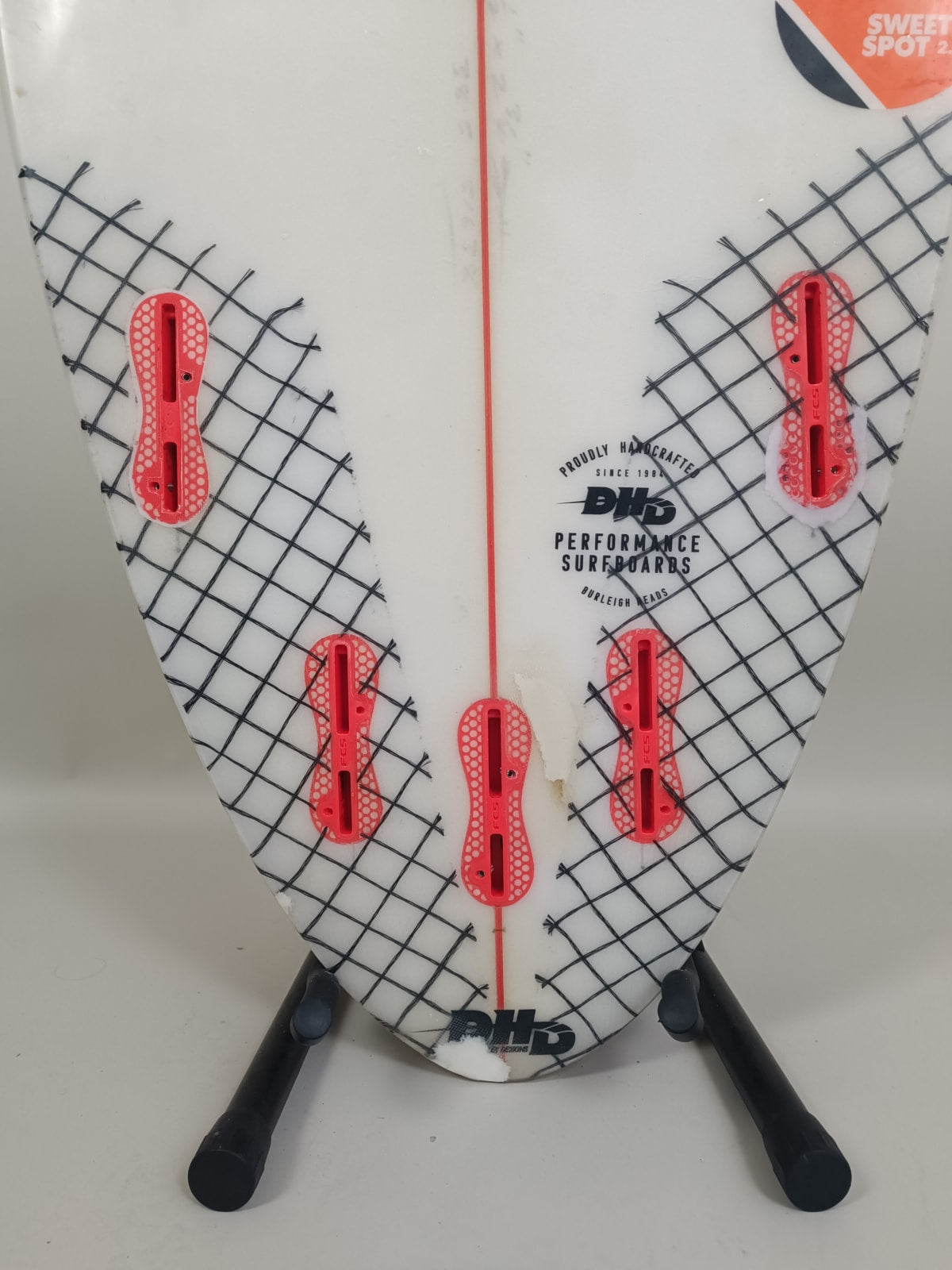 The DHD Sweet Spot is a versatile 6'6'' shortboard and mid-length surfboard designed for performance. With a volume of 38.5 litres, it features a PU construction and 6x4x4 glassing for durability. The board includes carbon white Innegra toe patches and tiger claws over fin boxes, enhancing strength and responsiveness.